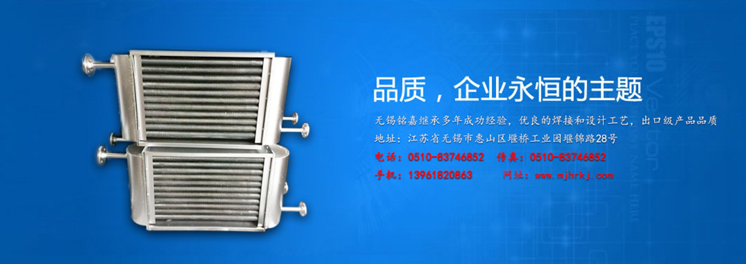 無錫銘嘉換熱科技有限公司是生產散熱器的專業工廠。 產品有:高溫水或蒸汽散熱器高溫導熱油散熱器表面空氣冷卻器油冷卻器鋁制串片式暖氣片空氣冷卻器翅片管換熱器